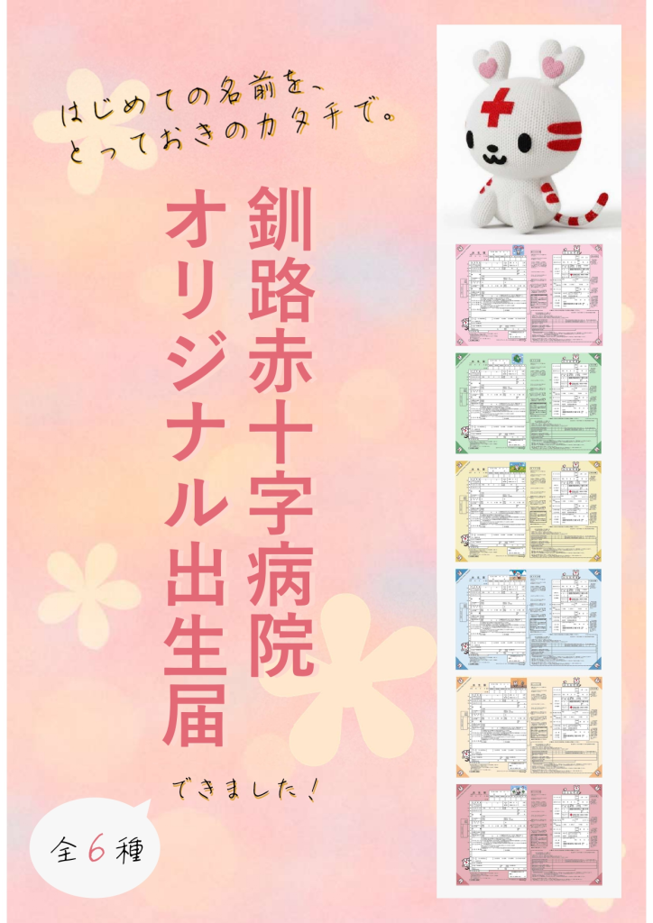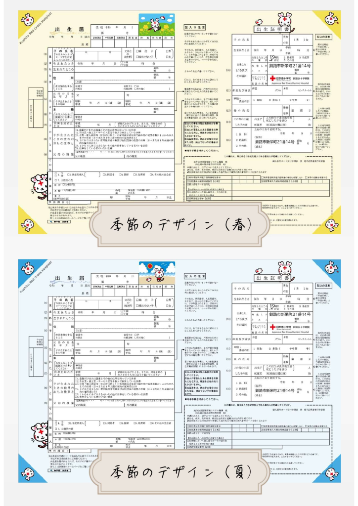 赤ちゃんの誕生は、ご家族にとってかけがえのない瞬間です。釧路赤十字病院では、その記念にぴったりなオリジナル出生届をご用意しました。春夏秋冬をイメージした全6種類のデザインから、お好きなものをお選びください。