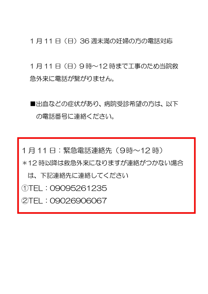 1 月 11 日(日)36 週未満の妊婦の方の電話対応