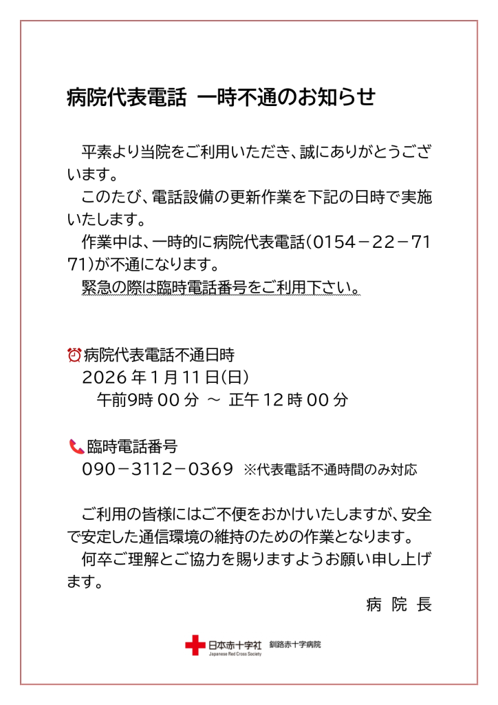 【1月11日(日)】病院代表電話 一時不通のお知らせ