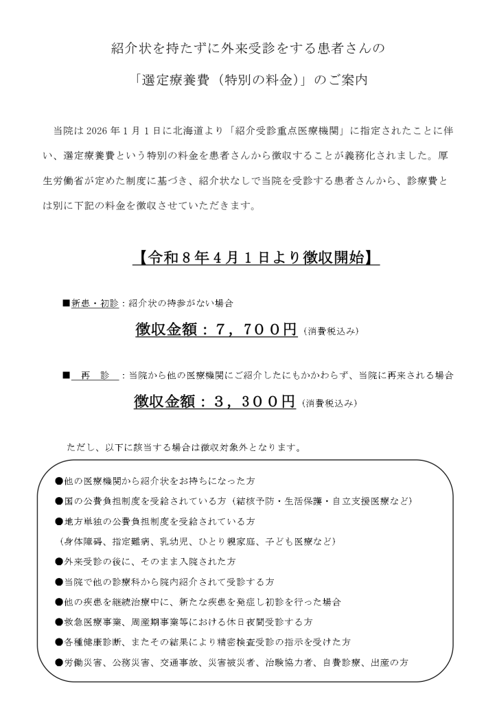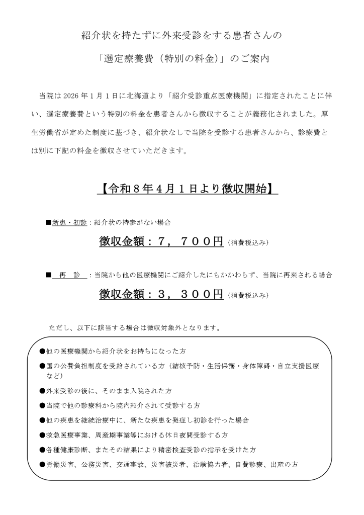 紹介状を持たずに外来受診をする患者さんの「選定療養費(特別の料金)」のご案内