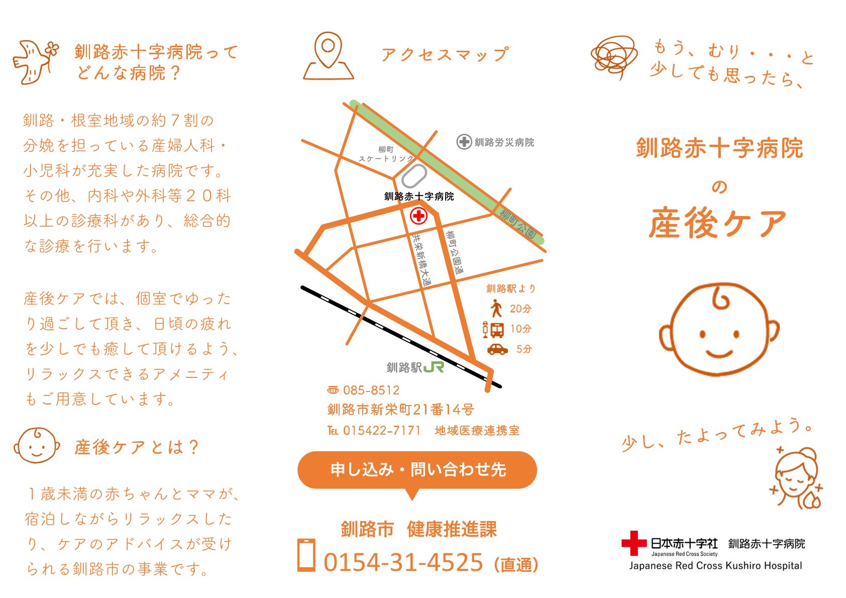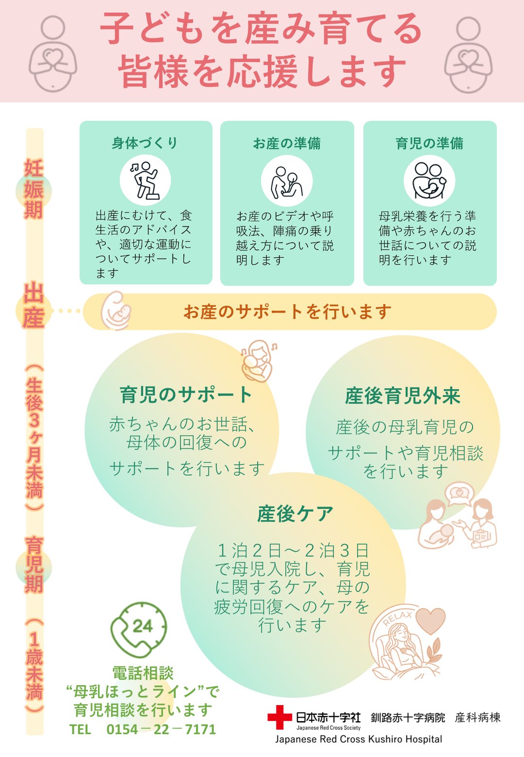 当院では、全国から里帰り出産を受け入れしております。どうぞ安心して受診ください。申込手続きについて不明な点がございましたら、お気軽に地域医療連携室(0154-22-7171代表)までご連絡をお願いいたします。